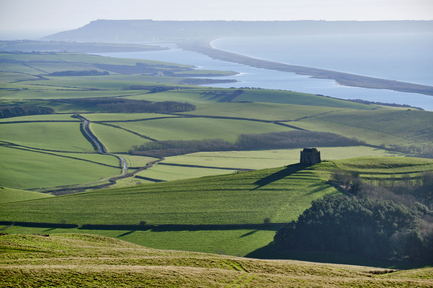 Looking east the silhouette of St Catherine’s Chapel and its long shadow is the focal point whilst in the distance West Fleet Lagoon and Chesil Beach stretch out to the Isle of Portland. Photographically I could argue this is a late afternoon shot but it’s such a wonderful scene, and for mid January the weather couldn’t have been more favourable.